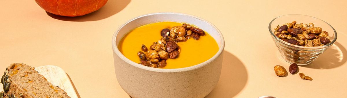 Cremige Kürbissuppe trifft auf crunchy Proteinmix – einfaches Rezept für herbstliche Wohlfühlmomente. Jetzt probieren und genießen!
