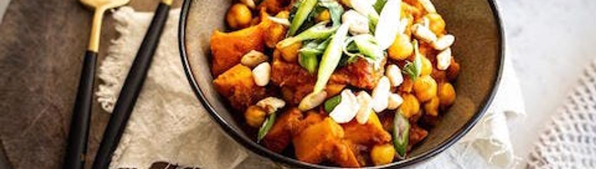 Græskar- og kikærtekarry med ris og cashewnødder