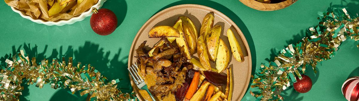 Cada año, si sigues una dieta vegana o vegetariana, te toca escuchar la misma pregunta: "Pero ¿tú qué comes en Navidad?". Pues este año vas a poder responder con la cabeza bien alta: setas ostra marinadas, patatas y verduras de raíz al horno bañadas en una salsa de asado vegana increíble. Es un plato reconfortante, festivo y delicioso que se convertirá, sin duda, en la estrella de tu menú navideño.