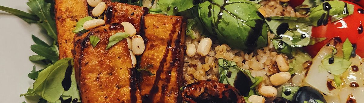 This vegan bowl contains a delicious balsamic dressing and is garnished with pine nuts.