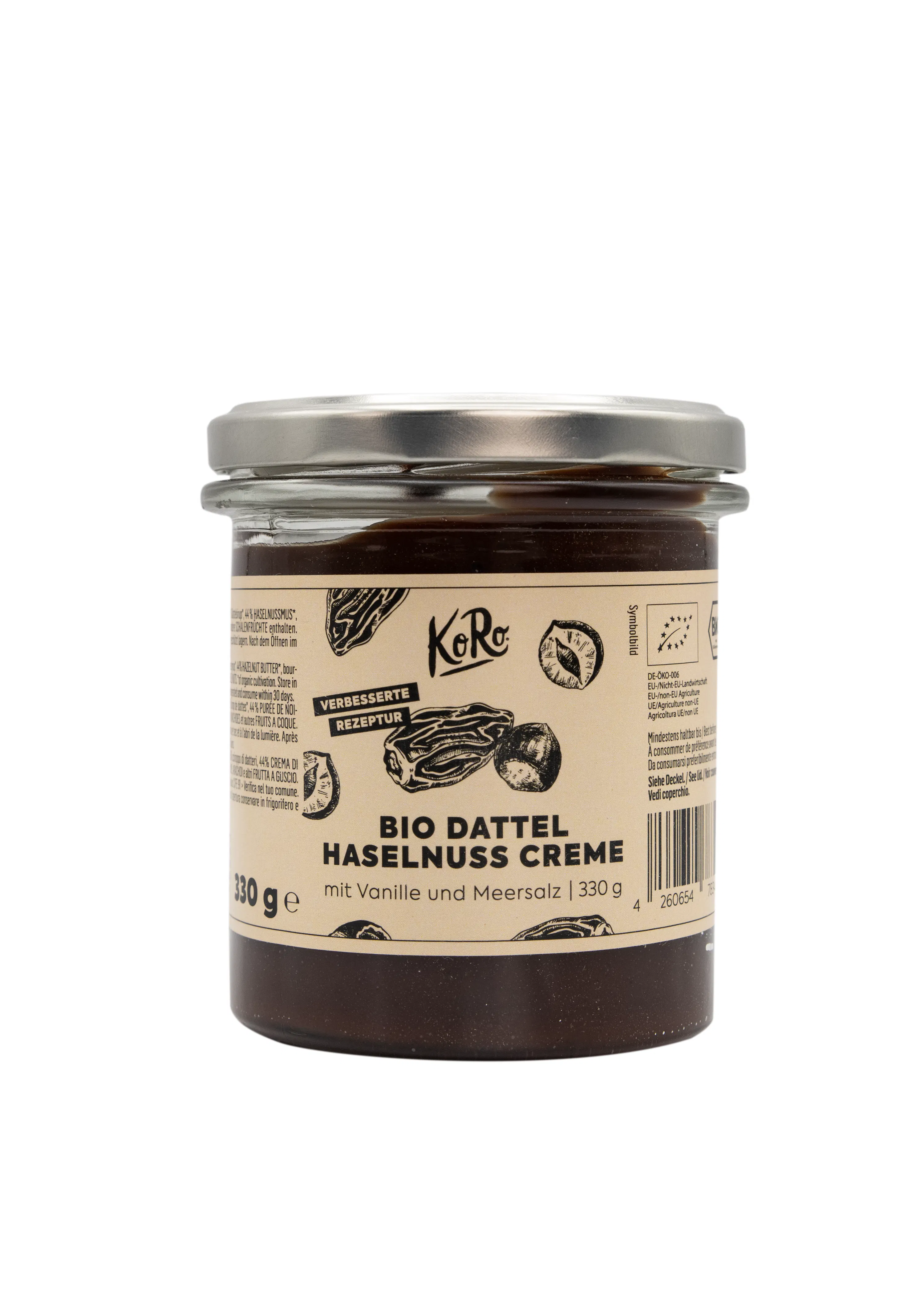 Notre crème de noisette aux dattes a fait peau neuve ! Désormais, notre produit phare aux noisettes se compose de quatre ingrédients sélectionnés : des dattes, des noisettes, de la vanille bourbon et du sel marin. Vous chercherez en vain du sucre raffiné, de l'huile de palme ou d'autres additifs.
