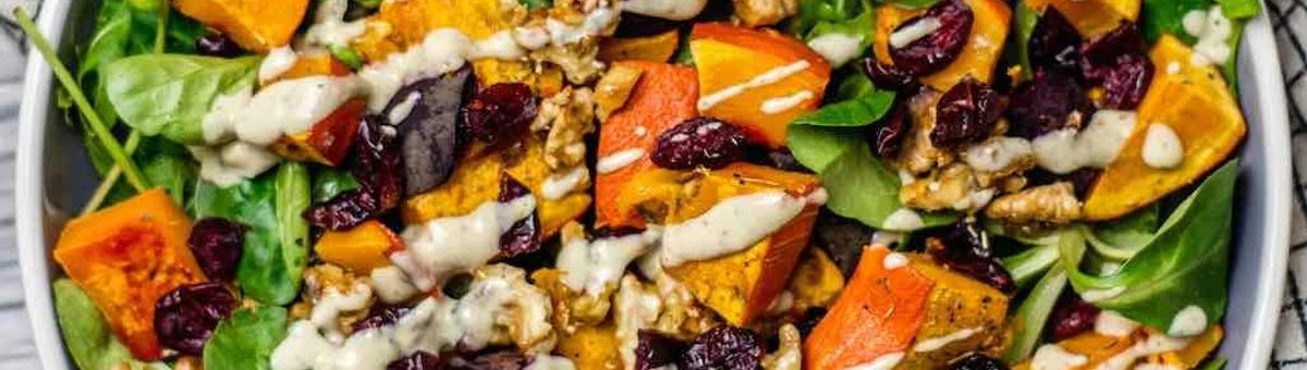 En snabb och god ugnsgrönsak med en topping av valnötter och tranbär, serverad med en cashewpurédressing på lammsallad och rucola.